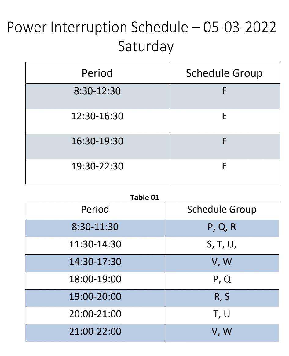 මේ අතර ඉරිදා දිනයේදී A,B,C කලාප සඳහා පැය 2යි මිනිත්තු 30ක කාලයක් විදුලිය විසන්ධි කිරීමට ද තීරණය කර තිබේ.