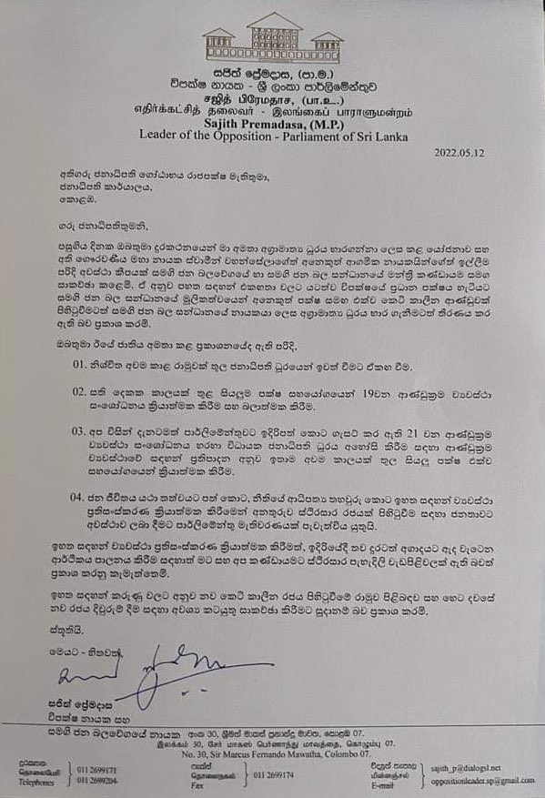 (UTV | කොළඹ) – අග්රාමාත්යධුරය භාර ගැනීමට තමන් සුදානම් බව සමගී ජනබල වේගය පක්ෂයේ නායක සජීත් ප්රේමදාස විසින් ජනාධිපති ගෝඨාභය රාජපක්ෂ මහතාට ලිපියක් යොමු කරමින් සඳහන් කර සිටිනවා.