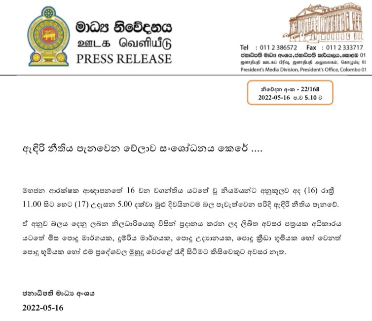 (UTV | කොළඹ) – අද රාත්රී 11.00 සිට දිවයින පුරා ඇඳිරි නීතිය පනවනු ලබන අතර හෙට (17) අලුයම 5.00ට ඇඳිරි නීතිය ඉවත් කෙරේ.