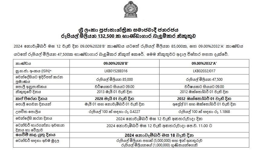 ශ්රී ලංකා මහ බැංකුව විසින් රුපියල් මිලියන 132,500ක භාණ්ඩාගාර බැඳුම්කර වෙන්දේසියක් නොවැම්බර් 12 දා සිදු කරයි. 2028 මැයි 01 කල්පිරෙන මිලියන 85,000 ක් වටිනා භාණ්ඩාගාර බැඳුම්කර, 2032 ඔක්තෝම්බර් 01 දිනට කල් පිරෙන රුපියල් මිලිටන 47,500 ක භාණ්ඩාගාර බැඳුම්කර මෙදින නිකුත් කරයි. මේ සඳහා නොවැම්බර් 18 වන විට ගෙවීම් සිදුකළ යුතු බවද මහ බැංකුව දැනුම් දෙයි.