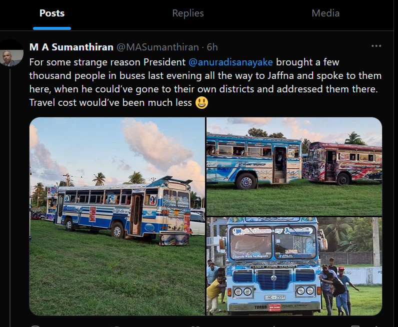 ජනාධිපති අනුර දිසානායක මහතාගේ ප්‍රධානත්වයෙන් ඊයේ (10) යාපනයේ පැවති ජන රැළිය සඳහා පිට දිස්ත්‍රික් වලින් ජනතාව ගෙනවිත් තිබූ බව දෙමළ ජාතික සන්ධාන හිටපු පාර්ලිමේන්තු මන් එම්.ඒ. සුමන්තිරන් මහතා සිය ට්විටර් ගිණුමේ සටහනක් තබා ඇත.