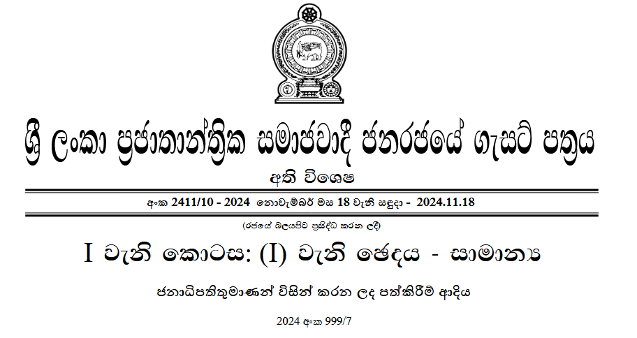 ශ්‍රි ලංකා ප්‍රජාතාන්ත්‍රික සමාජවාදී ජනරජයේ ආණ්ඩුක්‍රම ව්‍යවස්ථාවේ 44(2) ව්‍යවස්ථාවට අනුව ගරු ජනාධිපතිතුමා විසින් පහත සඳහන් ආමාත්‍යවරුන් 2024 නොවැම්බර් මස 18 වැනි දින සිට ක්‍රියාත්මක වන පරිදි පත් කරන ලද බව අති විශේෂ ගැසට් පත්‍රය නිකුත් කර තිබේ.