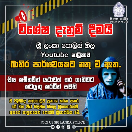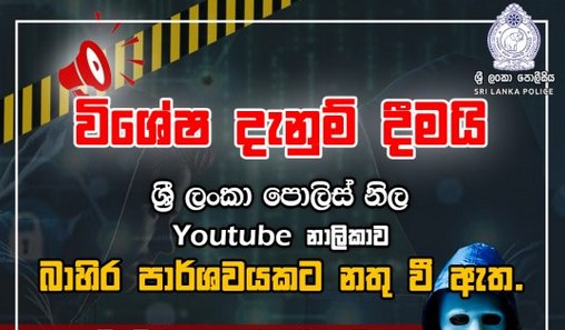 එමෙන්ම පවතින තත්ත්වය හමුවේ, සිය පාලනයෙන් තොරව යූටියුබ් නාලිකාවෙහි ක්රියාත්මක වන දෑ සම්බන්ධයෙන් කණගාටු වන බවත් ශ්රී ලංකා පොලීසිය සඳහන් කර තිබෙනවා.