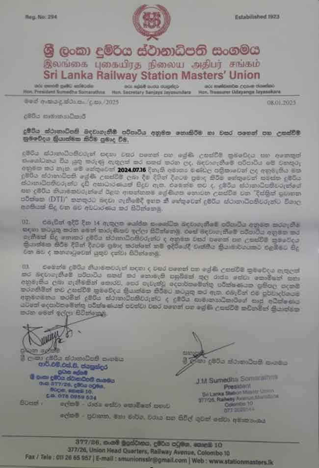Trending Newsඑසැන පුවත්දේශීයදුම්රිය ස්ථානාධිපතිලාගෙන් ආණ්ඩුවට රතු එළියක් by Editor OJanuary 8, 2025January 8, 20250142 Share0 උසස්වීම් ක්රමවේදය සහ තවත් ගැටලු කිහිපයක් මූලික කරගනිමින්, ඊට අදාළ විසඳුම් ඉදිරි දින 14 ඇතුළත ලබා නොදෙන්නේ නම් වෘත්තීය සමිති ක්රියාමාර්ගයකට එළැඹීමට තීරණය කළ බව දුම්රිය ස්ථානාධිපතිවරුන්ගේ සංගමය පවසයි. ඒ සම්බන්ධයෙන් නිකුත්කළ නිවේදනය,