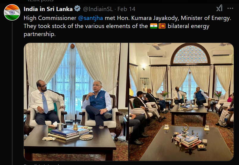 එහිදී ඉන්දියා ශ්රී ලංකා සබඳතා තවදුරටත් ශක්තිමත් කිරීම සඳහා පුළුල් ලෙස සාකච්ඡා කරන ලද බව ඉන්දීය මහ කොමසාරිස් නිල X ගිණුමේ සදහන් කර ඇත. මේ අතර බලශක්ති අමාත්ය කුමාර ජයකොඩි මහතා ද ඉන්දීය මහ කොමසාරිස්වරයා හමුවී දෙපාර්ශවය අතර බලශක්ති හවුල්කාරිත්වය සම්බන්ධයෙන් සාකච්ඡා කරන ලද බව X ගිණුම සඳහන්.
