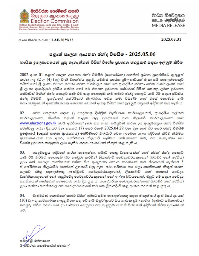 ඒ අනුව අදාළ සම්පූර්ණ කරන ලද අයදුම්පත ඡන්ද විමසීම පවත්වනු ලබන දිනයට දින 07කට පෙර එනම් අප්රේල් 29 වන දින හෝ ඊට පෙර ඡන්ද විමසීම් ප්රදේශයේ (පළාත් පාලන ආයතනය) තේරීම්භාර නිලධාරී වෙත ලැබෙන ලෙස යොමු කළ යුතුයි