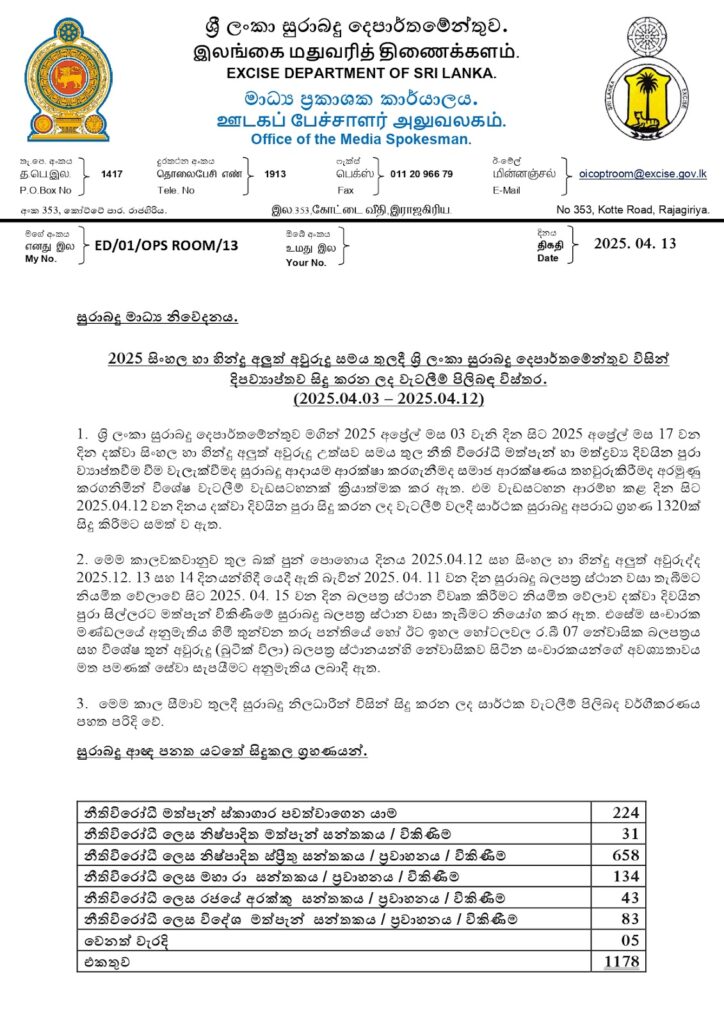 සුරාබදු දෙපාර්තමේන්තුව අප්‍රේල් 03 සිට 12 වෙනිදා දක්වා සිංහල අලුත් අවුරුදු සමය තුළ දිවයින පුරා නීති විරෝධී මත්පැන් ජාවාරම්, වැටලීම් 1,320 ක් සිදු කර පුද්ගලයන් 1,320 දෙනෙකු සැකපිට අත්අඩංගුවට ගෙන ඇතැයි එම දෙපාර්තමේන්තුව නිකුත් කළ නිවේදනයක සඳහන්. අප්‍රේල් 03 වෙනිදා සිට 12 වෙනිදා දක්වා කාලයේදී මෙම වැටලීම් සිදු කර ඇත.
