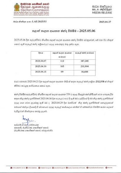 “කිසිදු වෙනස්කමක් නොමැතිව සියලූම රාජ්ය ආයතන සහ අනෙකුත් සියලුම ආයතනවල තැපැල් ඡන්ද දායකයින්ට මේ දින 4දී තමන්ගේ කාර්යාලයේදී අදාළ තැපැල් ඡන්ද පත්රිකා සලකුණු කිරීමට අවස්ථාව ලබාදී තිබෙනවා.” “ඒ වගේම මහනුවර සිරි දළදා වන්දනාව වෙනුවෙන් විශේෂ රාජකාරීවල යෙදී සිටින පොලීසියේ සියලුම නිලධාරීන් සඳහා විශේෂ තැපැල් ඡන්ද මධ්යස්ථානයක් මහනුවර උසස් බාලිකා විද්යාලයේ පිහිටුවනු ලබනවා.”