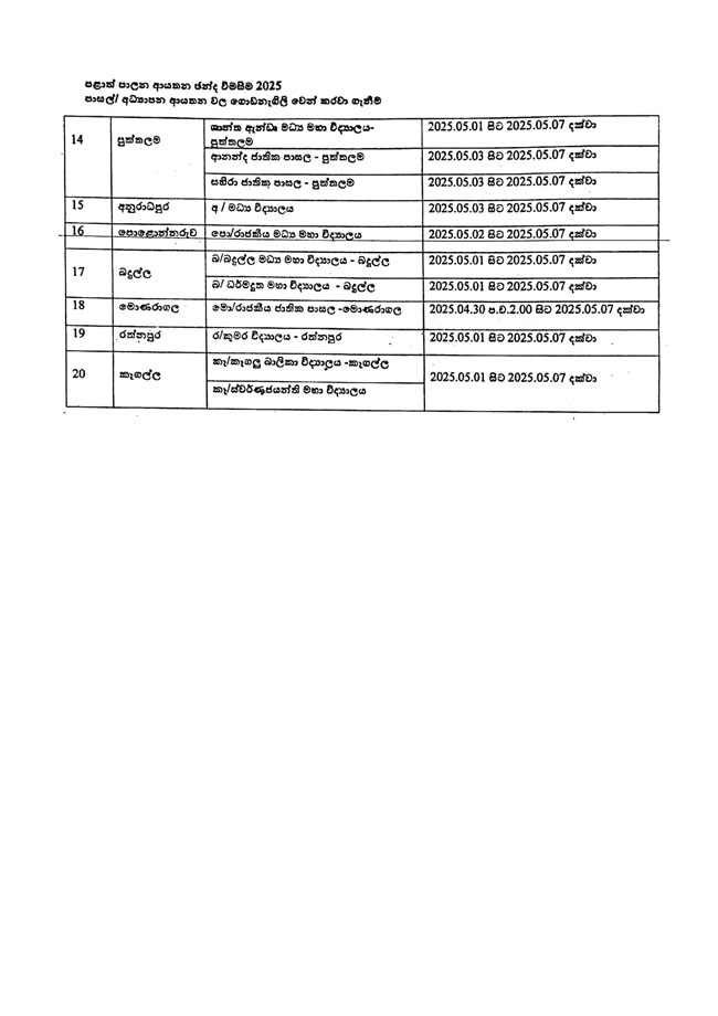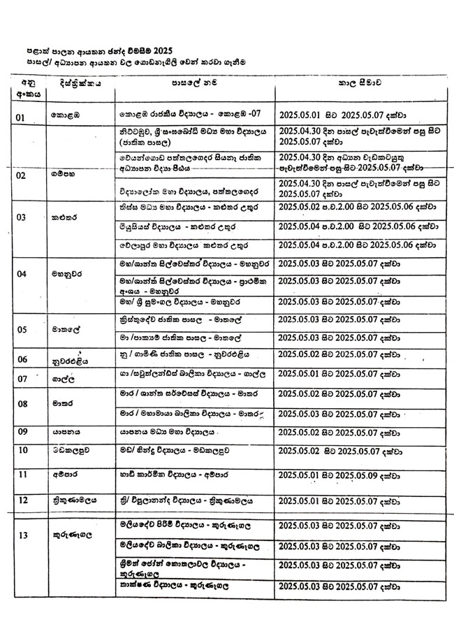 පළාත් පාලන ආයතන ඡන්ද විමසීම හේතුවෙන් මැයි මස 7 වන දින පාසල් කිහිපයක් වසා දැමෙන බව අධ්යාපන අමාත්යාංශය නිවේදනය කරයි. පහත සඳහන් පාසල් හැර සියලුම පාසල් එදිනට සාමාන්ය පරිදි පැවැත්වෙන බවද අමාත්යාංශය නිකුත් කළ නිවේදනයේ දැක්වේ.