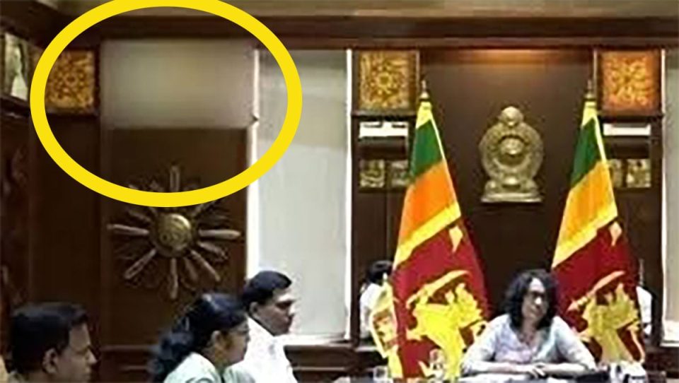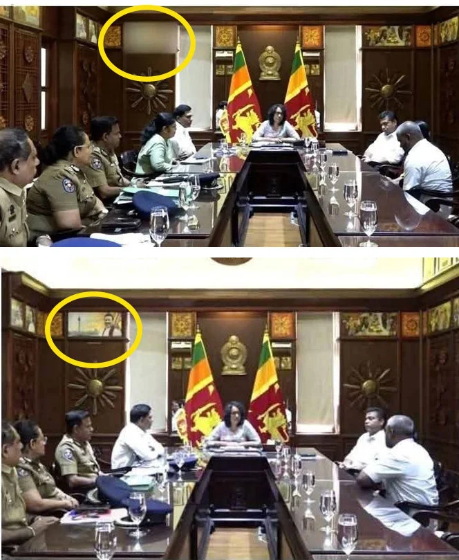 අග්රාමාත්ය හරිනි අමරසූරිය මහත්මිය සහභාගි වූ යේ සාකච්ඡාවක පසු පසින් තිබූ මහින්ද රාජපක්ෂ හිටපු ජනාධිපතිවරයාගේ පින්තූරය බොඳ කිරීමට කටයුතු කර ඇත. නමුත් මාධ්යන්හි විකාශනය වූ දර්ශනයන්හි පැහැදිලිවම මහින්ද රාජපක්ෂ මහතාගේ පින්තූරය එකී ස්ථානයේ දක්නට ලැබේ.