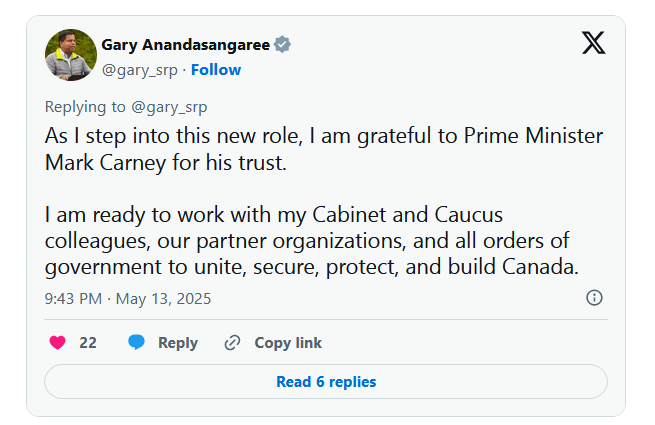 කැනඩාවේ නව මහජන ආරක්ෂක අමාත්යවරයා ලෙස ශ්රී ලාංකේය දෙමළ සම්භවයක් සහිත ගැරී ආනන්දසංගරී ) මහතා පත් කර තිබේ.