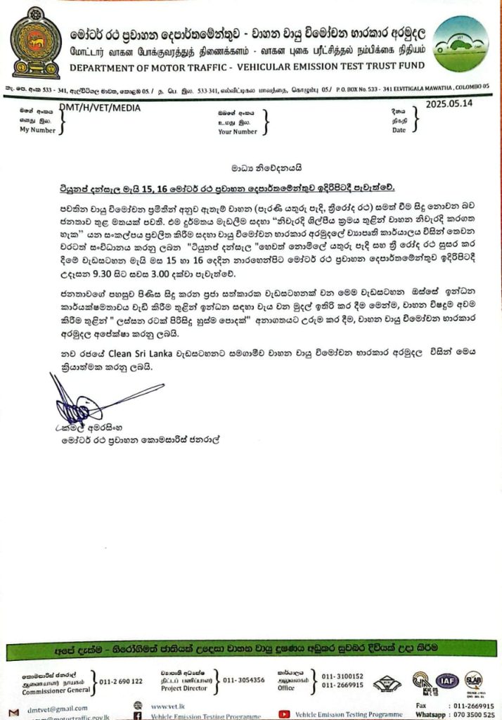 මෝටර් රථ ප්රවාහන දෙපාර්තමේන්තුවෙන් ‘ටියුනප් දන්සැලක්’ සංවිධානය කර තිබේ. එම දෙපාර්තමේන්තුව නිවේදනයක් නිකුත් කරමින් සඳහන් කරන්නේ අද සහ හෙට (මැයි මස 15 හා 16) යන දෙදින තුළ මෝටර් රථ ප්රවාහන දෙපාර්තමේන්තුව ඉදිරිපිට දී මෙම විශේෂ දන්සැල පැවැත්වෙන බවය.