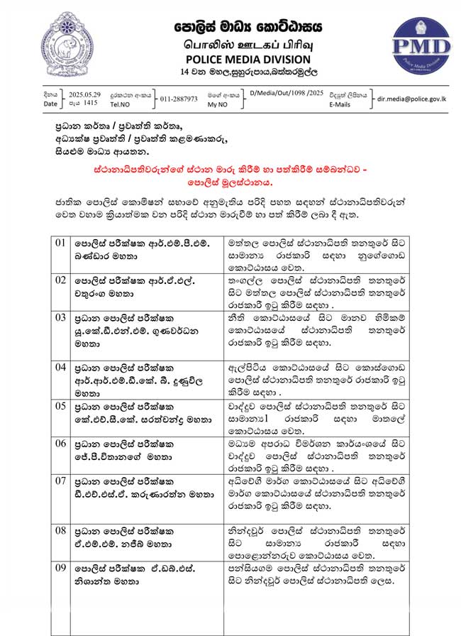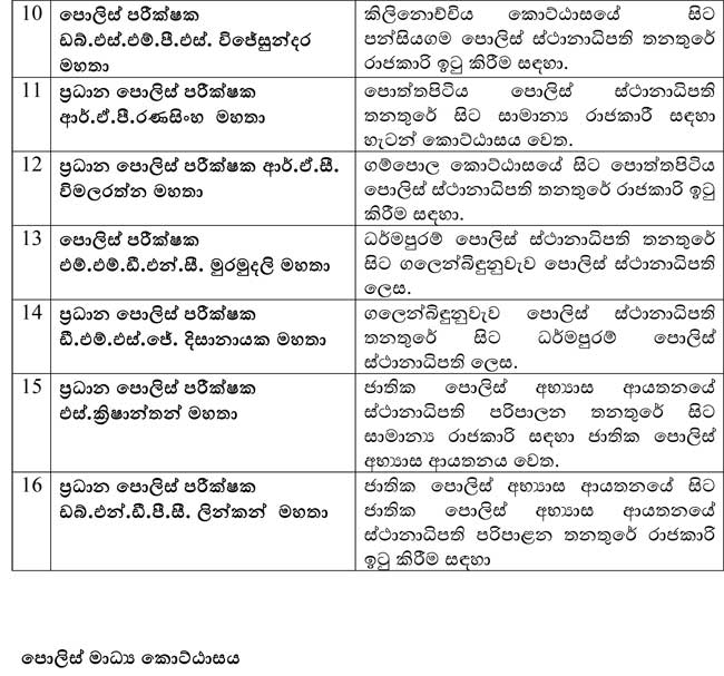 ප්‍රධාන පොලිස් පරීක්ෂක සහ පොලිස් පරීක්ෂකවරු 16 දෙනෙකු වහාම ක්‍රියාත්මක වන පරිදි ස්ථානමාරු කර තිබේ. ජාතික පොලිස් කොමිෂන් සභාවේ අනුමැතිය පිරිදි මෙම ස්ථානාධිපතිවරු වහාම ක්‍රියාත්මක වන පරිදි ස්ථාන මාරුවීම් හා පත්කිරීම් සිදුකර ඇත.