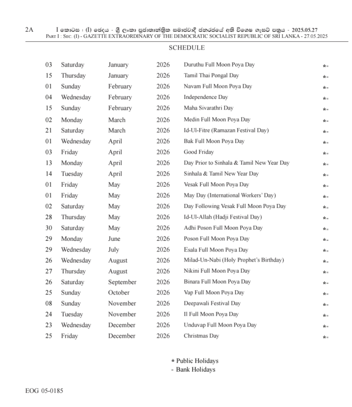 2026 වර්ෂය සඳහා රජයේ සහ බැංකු නිවාඩු ලැයිස්තුව, 2025 මැයි 27 වන අඟහරුවාදා නිකුත් කරන ලද අතිවිශේෂ ගැසට් පත්රය මගින් නිල වශයෙන් ප්රකාශයට පත් කර තිබේ.