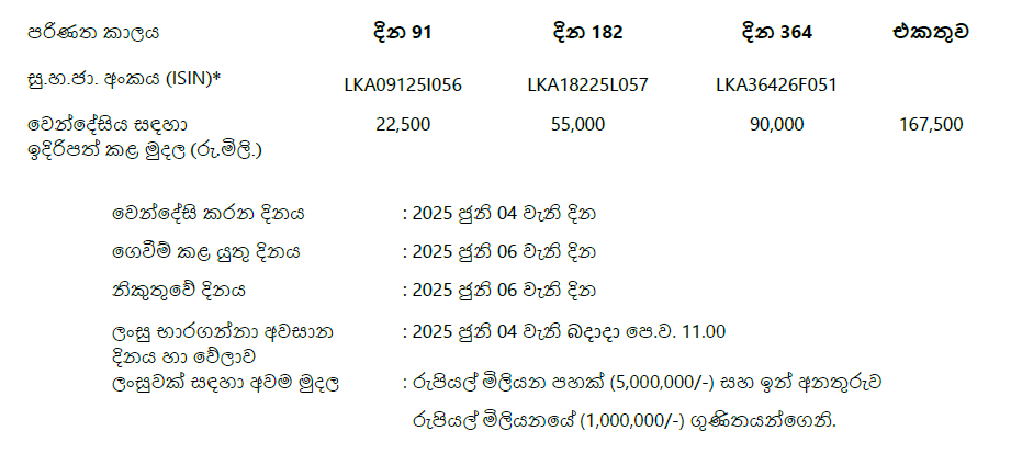 රුපියල් මිලියන 167,500 ක් වටිනා භාණ්ඩාගාර බිල්පත් නිකුත් කිරීමේ වෙන්දේසියක් සඳහා රජයේ සුරැකුම්පත් පිළිබඳ ප්රාථමික අලෙවිකරුවන්ගෙන් ලංසු කැඳවනු ලැබේ. 2025 ජුනි 04 වැනි දා වෙන්දේසිය පැවැත්වීමට නියමිතයි.
