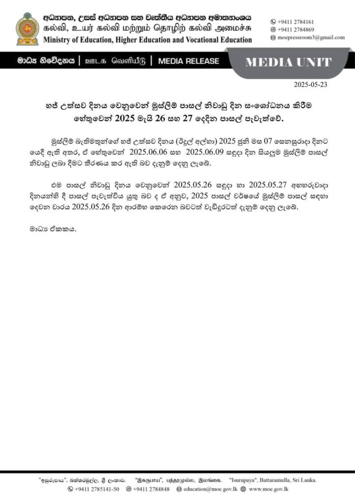 Trending Newsඑසැන පුවත්දේශීයහජ් උත්සවය වෙනුවෙන් මුස්ලිම් පාසල් නිවාඩු දෙන දිනයන් මෙන්න by Editor OJune 5, 2025June 5, 20250130 Share0 හජ් උත්සවය වෙනුවෙන්, මුස්ලිම් පාසල් සඳහා 2025 ජුනි 06 සහ 2025 ජුනි 09 යන දිනවල නිවාඩු ලබාදීමට තීරණය කර ඇති බව අධ්යාපන අමාත්යාංශය පවසයි. මේ සම්බන්ධයෙන් නිල දැනුම්දීම ඉදිරියේදී සිදුකරනු ඇති බව අමාත්යාංශය වැඩිදුරටත් දැනුම් දෙයි.