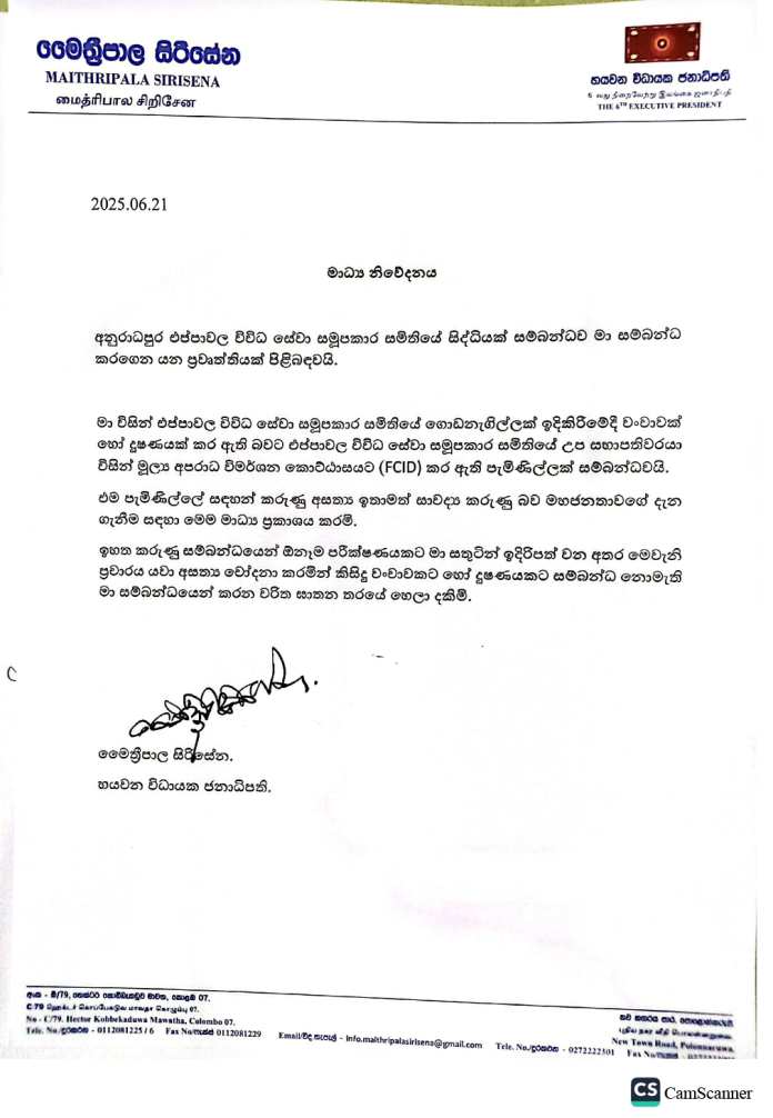 අනුරාධපුර එප්පාවල විවිධ සේවා සමූපකාර සමිතියේ උප සභාපතිවරයා විසින් මූල්ය අපරාධ විමර්ශන කොට්ඨාසයට කර ඇති පැමිණිල්ල සම්බන්ධයෙන් හිටපු ජනාධිපති මෛත්රීපාල සිරිසේන මහතා විසින් නිවේදනයක් නිකුත් කර තිබේ.