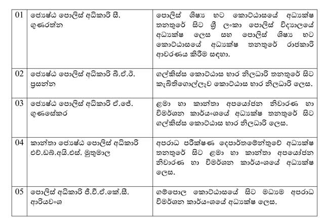 රාජ්ය නිවේදිත නිලධාරීන් 5 දෙනෙකුට වහාම ක්රියාත්මක වන පරිදි ස්ථාන මාරු කිරීම් හා පත්කිරීම් සිදුකර තිබේ. පොලිස් මාධ්ය කොට්ඨාසය නිවේදනයක් නිකුත් කරමින් සඳහන් කර ඇත්තේ, ජාතික පොලිස් කොමිෂන් සභාවේ අනුමැතියට යටත්ව මෙය සිදුකර ඇති බවය.