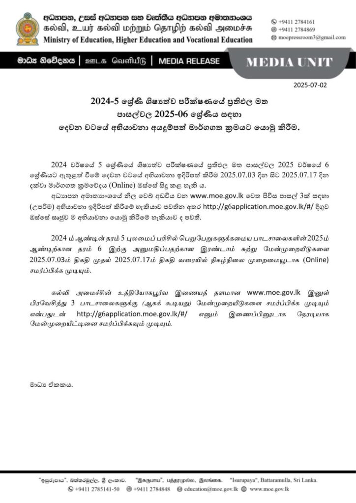 පහ ශ්රේණිය 2024 ශිෂ්යත්ව විභාගයේ ප්රතිඵල මත පාසල්වල 2025 වර්ෂයේ 6 ශ්රේණියට ඇතුළත් වීමේ දෙවැනි වටයේ අභියාචනා ඉදිරිපත් කිරීම අද (03) සිට 17 වැනිදා දක්වා මාර්ගගත ක්රමවේදය ඔස්සේ සිදු කළ හැකි බව අධ්යාපන අමාත්යාංශය දැනුම් දෙයි.