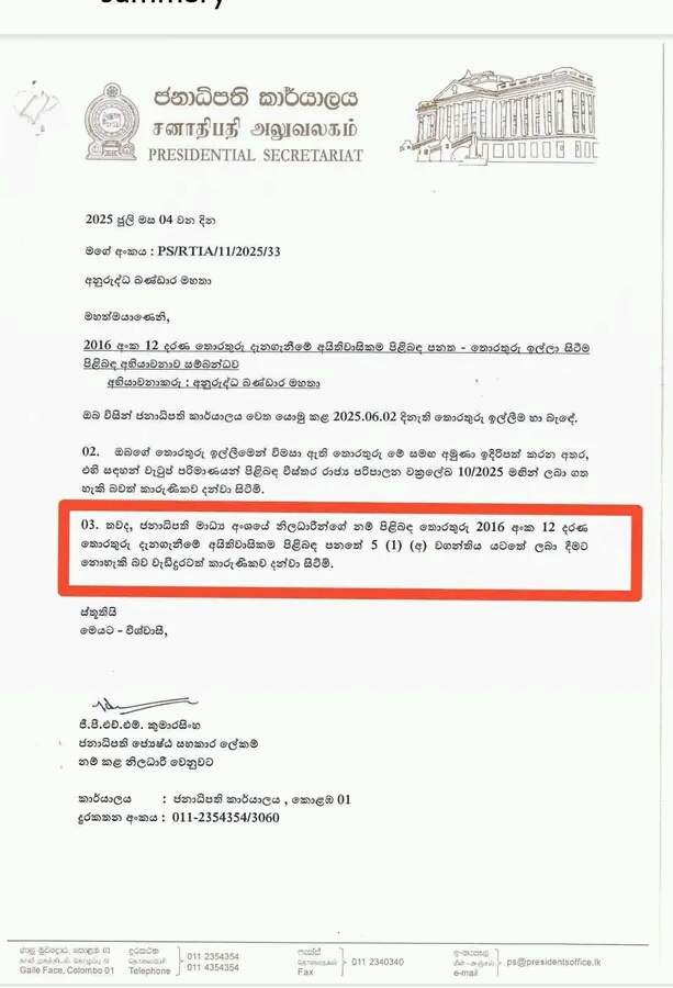 2016 අංක 12 දරණ තොරතුරු දැනගැනීමේ අයිතිවාසිකම පිළිබඳ පනතින් ජනාධිපති මාධ්ය අංශයේ සියලු තනතුරු, ඒවාට පත්කළ අයගේ නම්, පත්වීම් දිනය, එක් එක් තනතුර සඳහා වන වැටුප යන තොරතුරු ලබා දෙන ලෙස අනුරුද්ධ බණ්ඩාර මහතා 2025 ජූනි 02 වන දින ජනාධිපති ලේකම් කාර්යාලයෙන් මෙම ඉල්ලීම කර තිබිණ.