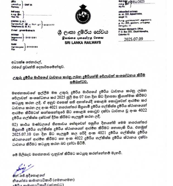 මහජනතාවගේ ඉල්ලීම මත උතුරු මාර්ගයේ ධාවනය කරනු ලබන දුම්රිය වේලාවන් සංශෝධනය කර ඇති බව ශ්රී ලංකා දුම්රිය සේවය නිවේදනය කර ඇත. මෙම සංශෝධනය 2025 ජූලි 07 සිට දිනපතා ක්රියාත්මක වන බව එම නිවේදනයේ සඳහන්.
