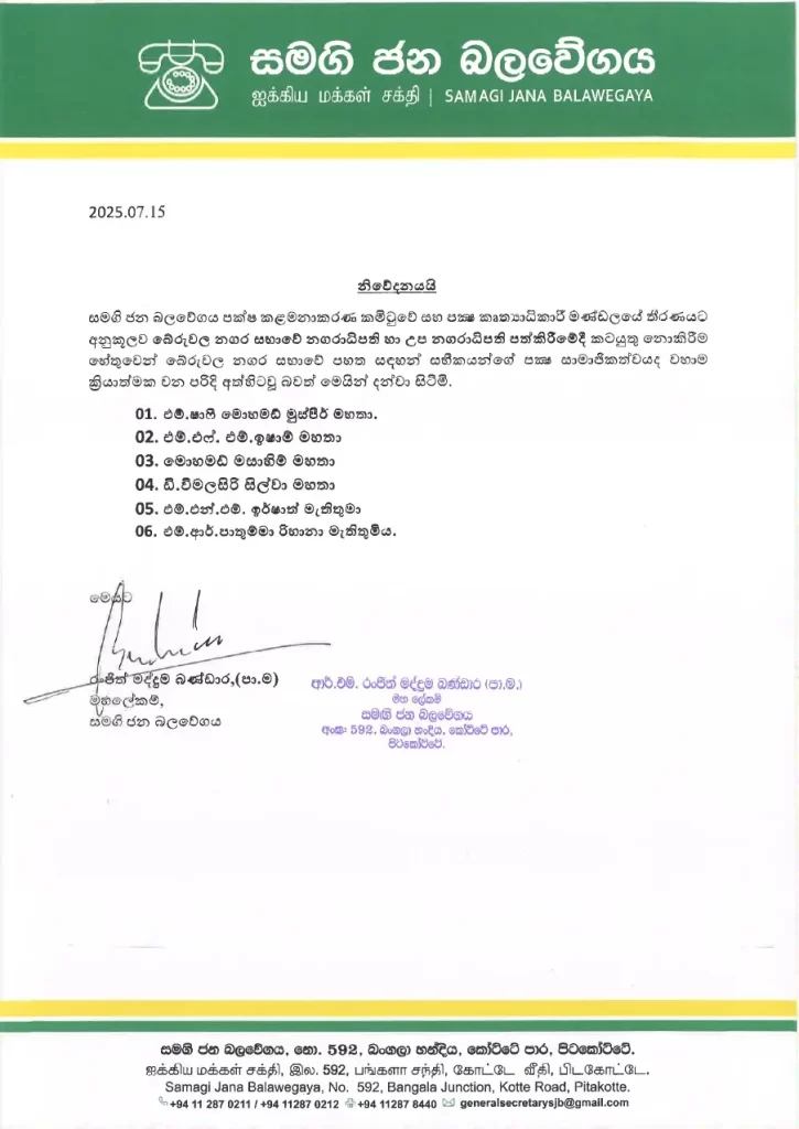 මේ අතර, බේරුවල නගර සභාවේ නගරාධිපති හා උප නගරාධිපති පත්කිරීමේදී ජාතික ජන බලවේගයට සහාය දුන් බේරුවල නගර සභාවේ සමගි ජන බලවේගයේ සාමාජිකයින් හය දෙනෙකුගේ පක්ෂ සාමාජිකත්වය අත්හිටුවීමට පියවර ගෙන තිබේ.