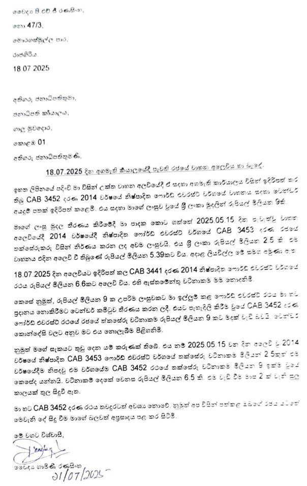 රජයේ වාහන අළෙවියකදී සිදුවූ බව කියන විෂමතා සම්බන්ධයෙන් වෛද්‍යවරයෙකු විසින් ජනාධිපතිවරයා වෙත පැමිණිල්ලක් ඉදිරිපත් කර තිබේ. 2025 ජූලි 18 වන දින අග්‍රාමාත්‍ය කාර්යාලයේදී පැවති රජයේ වාහන අළෙවියකදී සිදුවූ අසාධාරණයක් සම්බන්ධයෙන් රාජගිරියේ පදිංචි වෛද්‍ය ගාමිණී රණසිංහ මහතා විසින් ජනාධිපතිවරයා දැනුවත් කර ඇත.