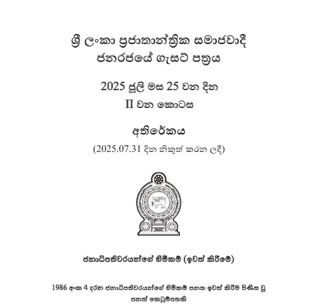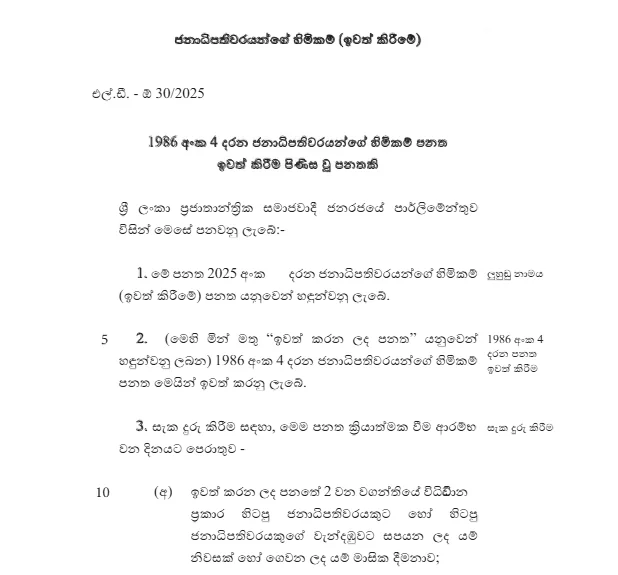 Trending Newsඑසැන පුවත්දේශීයහිටපු ජනාධිපතිවරුන්ගේ හිමිකම් අහෝසි කරන ගැසට් නිවේදනය මෙන්න by Editor OJuly 31, 2025July 31, 2025082 Share0 හිටපු ජනාධිපතිවරුන්ගේ හිමිකම් පනත අහෝසි කෙරෙන පනත් කෙටුම්පත ගැසට් කර තිබේ. එම ගැසට් නිවේදනය පහතින්