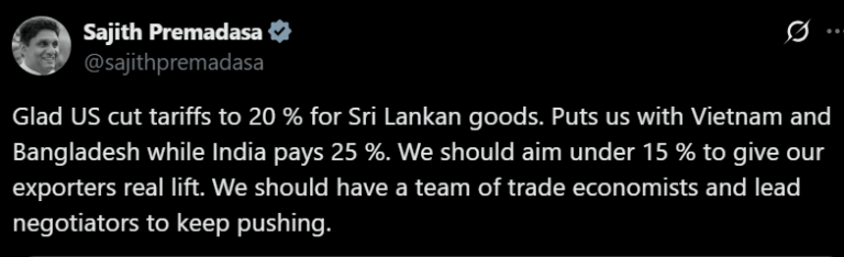 ඇමරිකා එක්සත් ජනපදය විසින් ශ්රී ලංකාවට පනවන ලද අන්යෝන්ය තීරු බදු අනුපාතය සියයට විස්සක් දක්වා පහත දැමීම ගැන සතුටට පත්වන බව විපක්ෂ නායක සජිත් ප්රේමදාස මහතා සඳහන් කරයි.