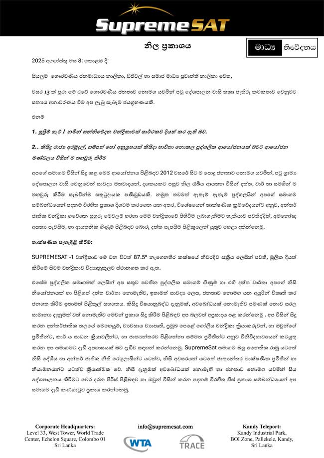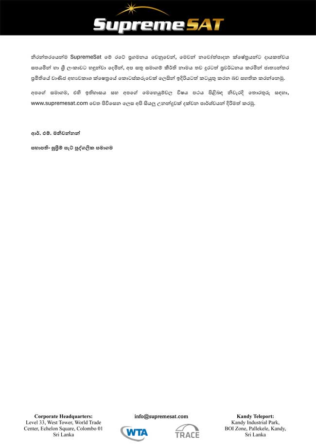 නිවේදනයක් නිකුත් කරමින් එහි සභාපති ආර්.එම්. මනිවන්නන් මහතා වැඩිදුරටත් සඳහන් කර ඇත්තේ, නිරන්තරයෙන් සුප්රීම් සැට් රටේ ප්රගමනය වෙනුවෙන්, නවෝත්පාදන ක්ෂේත්රයට දායකත්වය දක්වමින් තවදුරටත් සමාගමේ කීර්ති නාමය තව දුරටත් ප්රවර්ධනය කරමින් ජාත්යන්තර ප්රමිතියේ වාණිජ අභ්යවකාශ ක්ෂේත්රයේ කොටස්කරුවෙකු ලෙස ඉදිරියටත් කටයුතු කරන බවය.