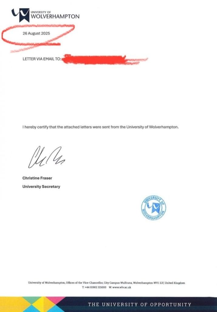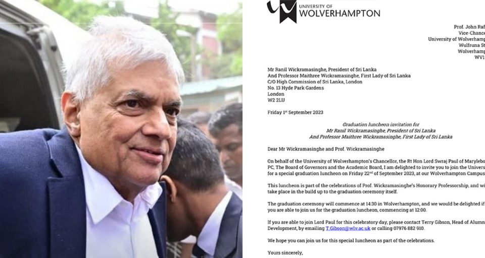 හිටපු ජනාධිපති රනිල් වික්රමසිංහ මහතාට වුල්වර්හැම්ප්ටන් විශ්වවිද්යාලය විසින් එවන ලද ආරාධනා පත්රය සත්ය එකක් බව එංගලන්තයේ වුල්වර්හැම්ප්ටන් විශ්වවිද්යාලය තහවුරු කරයි.