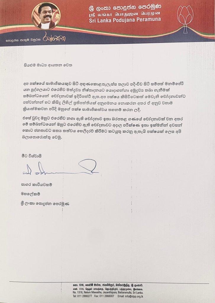 ශ්රී ලංකා පොදු ජනපෙරමුණේ ලිපි ශිර්ෂයෙන් නිකුත් කර ඇති එම නිවේදනය මෙසේය.
