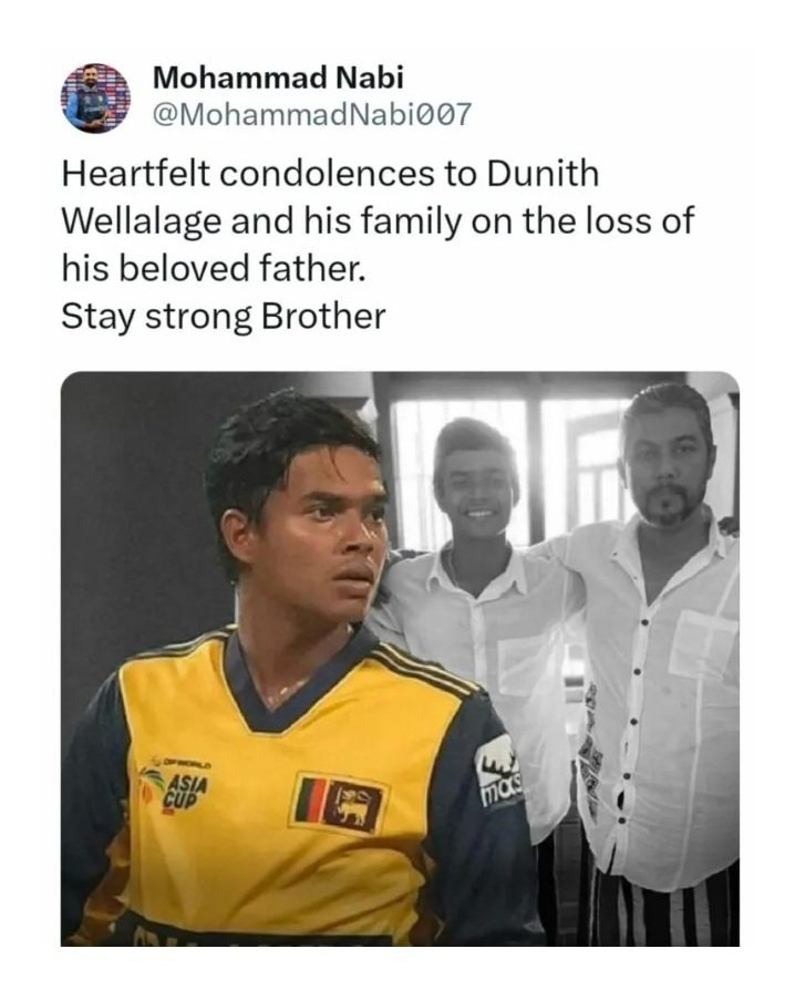 දුනිත් වෙල්ලාලගේ, පියාගේ හදිසි අභාවය පිළිබඳ අඇෆ්ගනිස්ථාන ක්රීඩක මොහොමඩ් නබී විසින් කණගාටුව පළ කර, විශේෂ සටහනක් යොදා තිබේ.