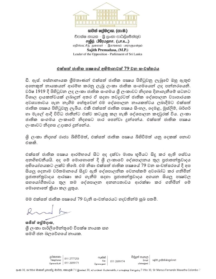 එහෙත් එක්සත් ජාතික පක්ෂයේ 79 වන සංවත්සරය වෙනුවෙන් සජිත් ප්රේමදාස මහතා සුබ පැතුම් පණිවුඩයක් නිකුත් කර තිබිණ..
