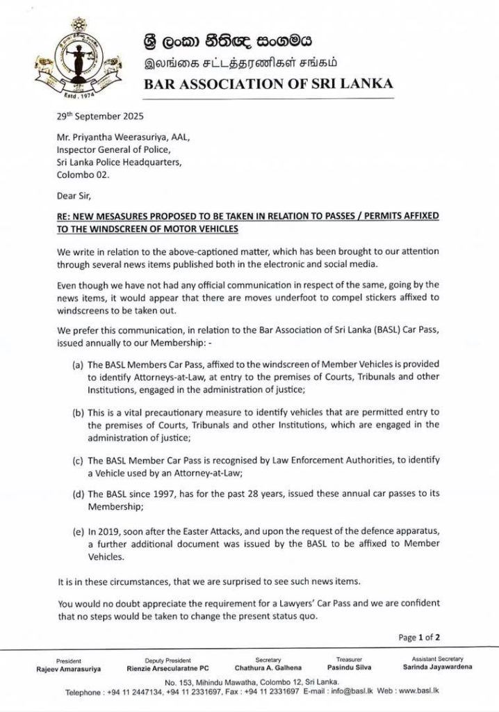මෝටර් රථවල ඉදිරි වීදුරුව මත ප්රදර්ශනය කරන නීතිඥවරුන් හඳුනා ගැනීමේ වාහන අවසරපත් (Lawyers’ Car Passes) අවලංගු කිරීමට අදාල සිද්ධිය සම්බන්ධයෙන් ශ්රී ලංකා නීතිඥ සංගමය (BASL) විසින් පොලිස්පතිවරයා වෙත ලිපියක් යොමු කරමින් සිය ස්ථාවරය පැහැදිලි කර තිබේ.