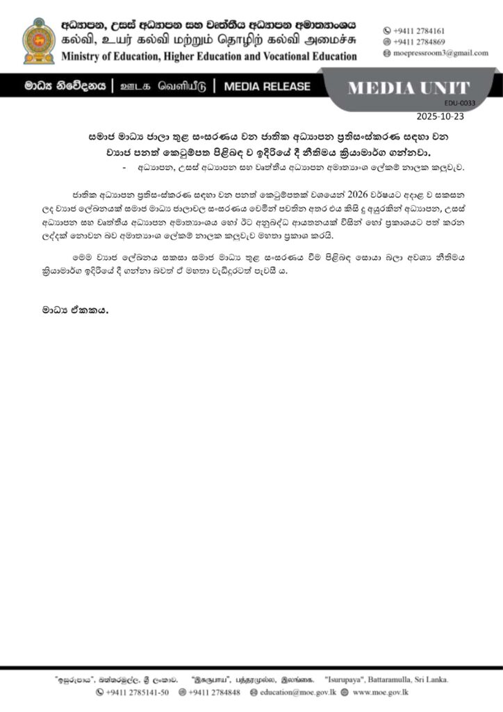 ජාතික අධ්යාපන ප්රතිසංස්කරණ සඳහා වන පනත් කෙටුම්පතක් වශයෙන් 2026 වර්ෂයට අදාළ ව සකසන ලද ව්යාජ ලේඛනයක් සමාජ මාධ්ය ජාලාවල සංසරණය වෙමින් පවතින අතර එය කිසි දු අයුරකින් අධ්යාපන, උසස් අධ්යාපන සහ වෘත්තීය අධ්යාපන අමාත්යාංශය හෝ ඊට අනුබද්ධ ආයතනයක් විසින් හෝ ප්රකාශයට පත් කරන ලද්දක් නොවන බව අමාත්යාංශ ලේකම් නාලක කලුවැව මහතා ප්රකාශ කරයි.