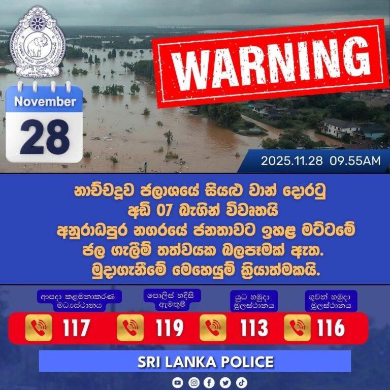 එම තත්ත්වය මත අනුරාධපුර නගරය ආශ්‍රිත ප්‍රදේශවලට ඉහළ ජල ගැලීම් තත්ත්වයක් ඇතිවිය හැකි බව පොලිසිය සඳහන් කරයි.