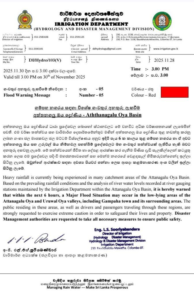 ඒ අනුව වහාම ආරක්ෂිත ස්ථාන කරා යොමු වන ලෙස ගම්පහ නගරය අවට පහත් බිම්වල වෙසෙන ජනතාවට දැනුම් දෙයි.