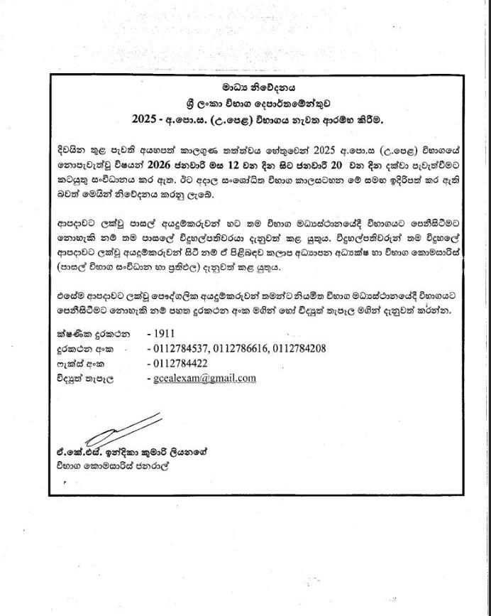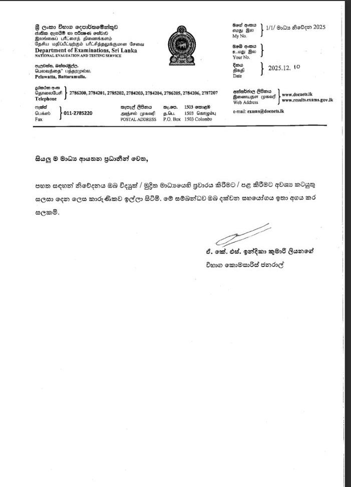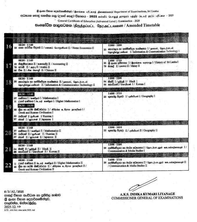 අයහපත් කාලගුණ තත්ත්වය හේතුවෙන් 2025 අ.පො.ස (උ.පෙළ) විභාගයේ නොපැවැත්වූ විෂයන් සඳහා වූ කාලසටහන අද (10) පස්වරුවේ නිකුත් කළේය.