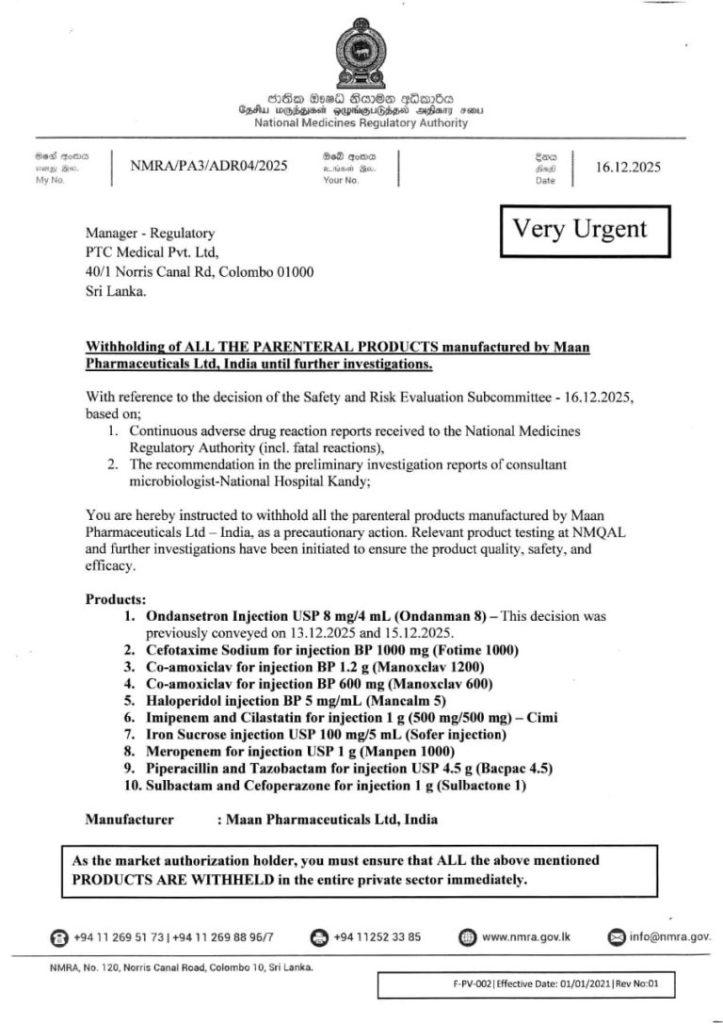 1. ඔන්ඩන්සෙට්රෝන් එන්නත් USP 8 mg/4 mL (ඔන්ඩන්මන් 8) – මෙම තීරණය මීට පෙර 2025.12.13 සහ 2025.12.15 යන දිනවල දැනුම් දෙන ලදී.