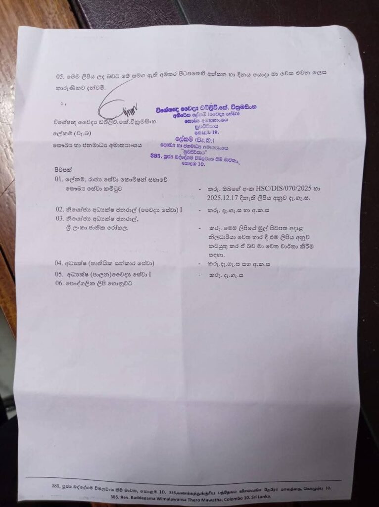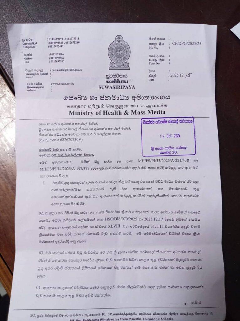 සෞඛ්‍ය හා ජනමාධ්‍ය අමාත්‍යාංශයේ ලිපි ශීර්ෂය යටතේ ඊට අදාළ ලිපිය නිකුත් කර ඇත.
