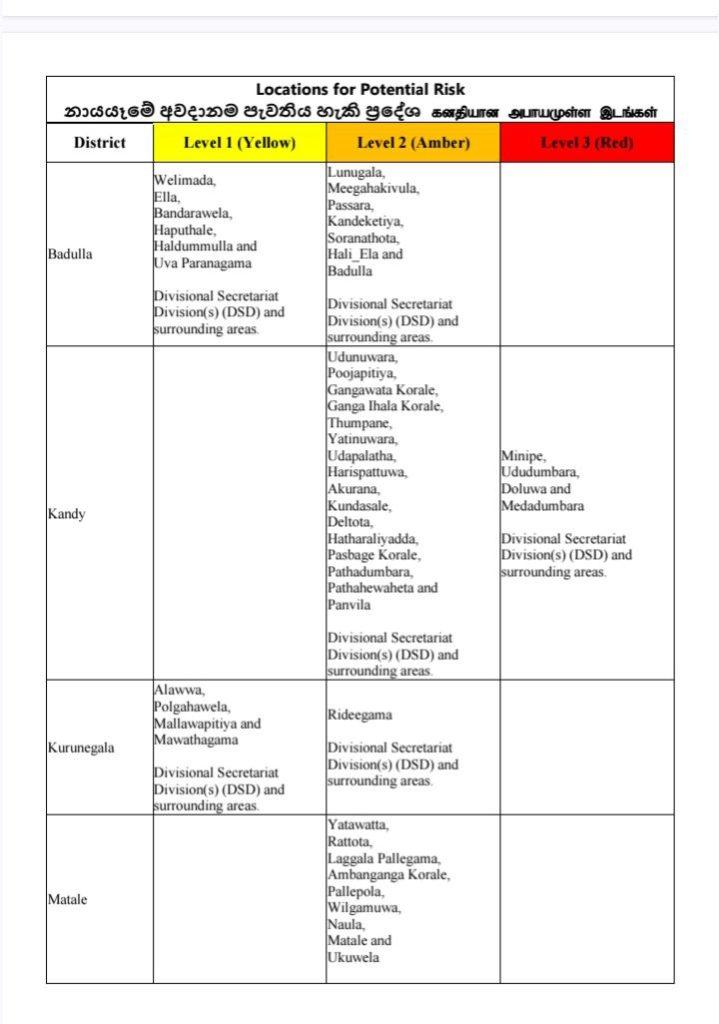 ඒ අනුව මහනුවර දිස්ත්රික්කයේ දොලුව, උඩුදුම්බර, මිනිපේ සහ මැදදුම්බර යන ප්රාදේශීය ලේකම් කොට්ඨාස වෙත නායයෑම් රතු නිවේදන නිකුත් කර ඇත.