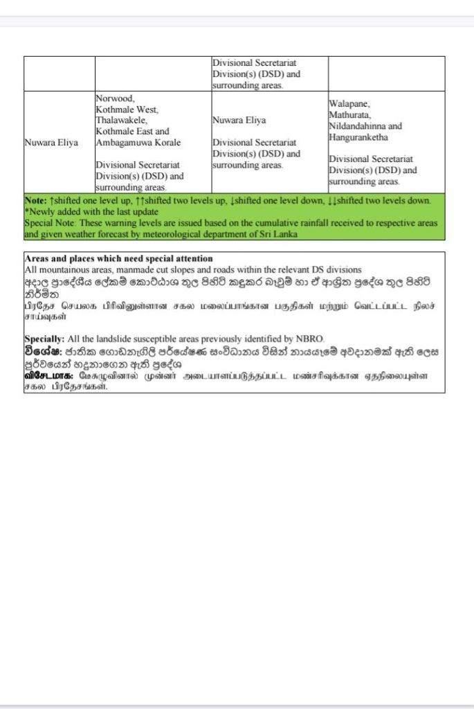 නුවරඑළිය දිස්ත්රික්කයේ මතුරට, නිල්දණ්ඩාහින්න, වලපනේ සහ හඟුරන්කෙත යන ප්රාදේශීය ලේකම් කොට්ඨාශවලට ද නායයෑම් අනතුරු ඇඟවීමේ රතු නිවේදන නිකුත් කර ඇති බව ජාතික ගොඩනැගිලි පර්යේෂණ සංවිධානය වැඩිදුරටත් සඳහන් කරයි.