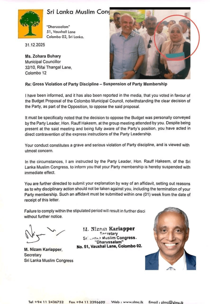 ඒ බව දන්වමින් අද (31) දිනයේදීම ඇය වෙත එම කොංග්රසේ මහලේකම් නිසාම් කාරියප්පර් මහතා යොමු කරන ලද ලිපිය පහත දැක්වේ.