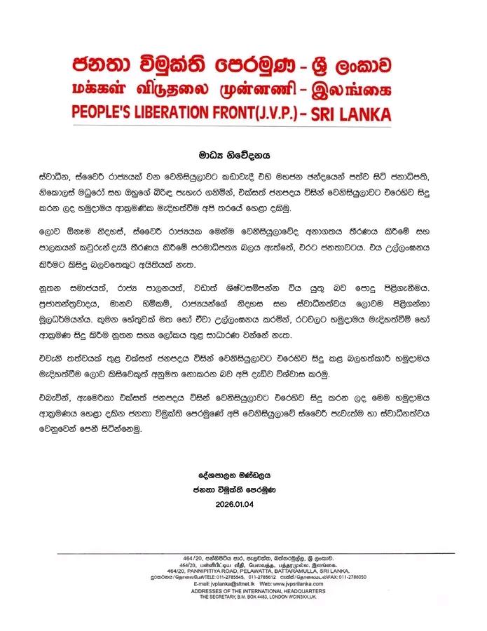 ස්වාධීන, ස්වෛරී රාජ්‍යයක් වන වෙනිසියුලාවට කඩාවැදී එහි මහජන ඡන්දයෙන් පත්ව සිටි ජනාධිපති, නිකොලස් මධුරෝ සහ ඔහුගේ බිරිඳ පැහැර ගනිමින්, එක්සත් ජනපදය විසින් වෙනිසියුලාවට එරෙහිව සිදු කරන ලද හමුදාමය ආක්‍රමණික මැදිහත්වීම අපි තරයේ හෙළා දකිමු.