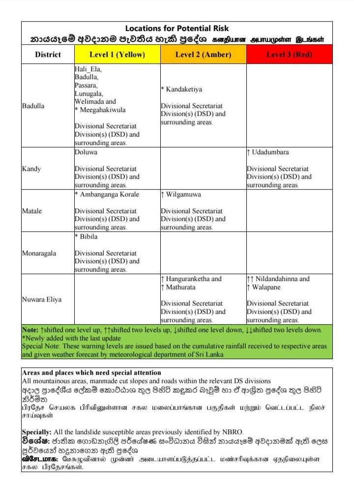 මේ අතර දිස්ත්රික්ක තුනක් සඳහා අවදානයෙන් සිටින ලෙස නායයෑම් අනතුරු ඇඟවීම් නිකුත් කර ඇති අතර, තවත් දිස්ත්රික්ක 4ක් සඳහා විමසිලිමත් වෙන ලෙස නායයෑම් අනතුරු අඟවා තිබේ.