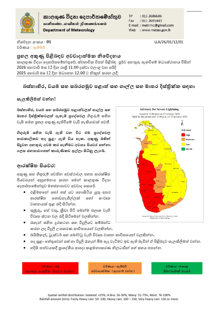 එහි දැක්වෙන්නේ, බස්නාහිර, වයඹ සහ සබරගමුව පළාත්වලත් ගාල්ල සහ මාතර දිස්ත්රික්කවලත් ඇතැම් ප්රදේශවල ගිගුරුම් සහිත වැසි සමග ප්රබල අකුණු ඇතිවිිිහැකි බවයි…