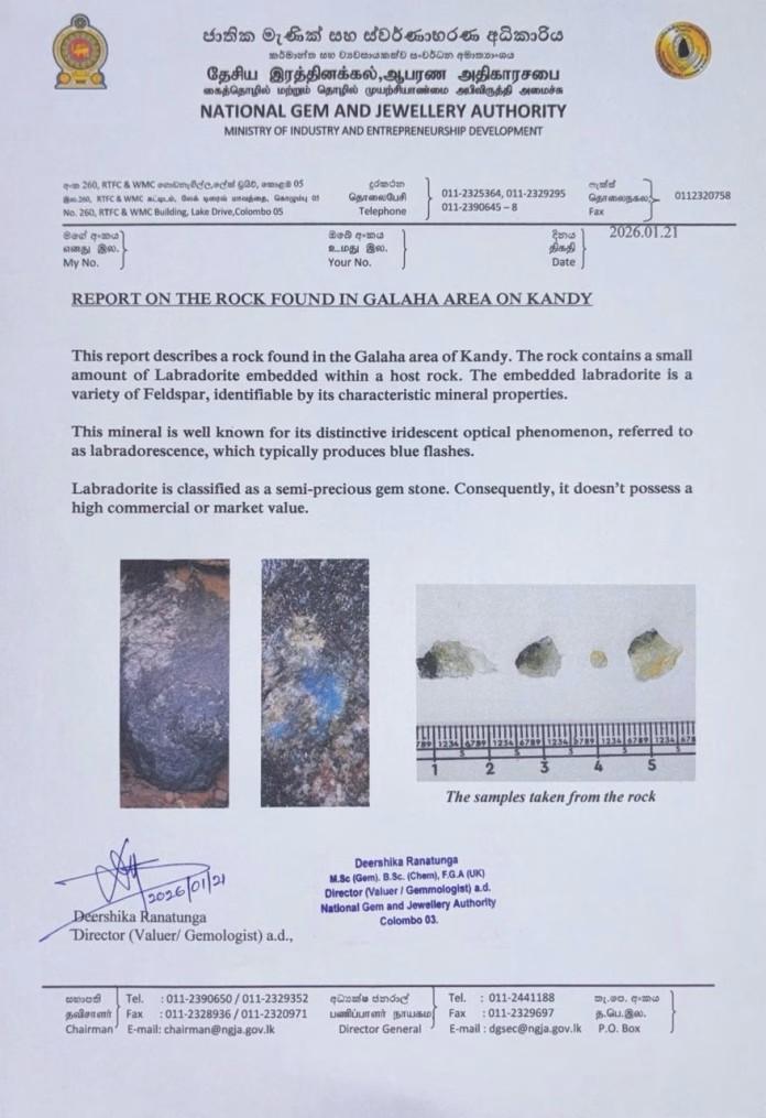 මහනුවර ගලහා ප්‍රදේශයෙන් සොයාගත් පාෂාණයට ඉහළ වාණිජ හෝ වෙළෙඳ වටිනාකමක් නොමැති බව ජාතික මැණික් හා ස්වාර්ණාභරණ අධිකාරිය දැනුම් දී තිබේ.