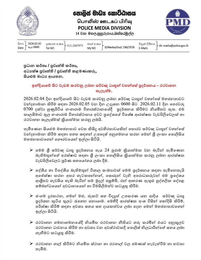 ඉන්දියාවෙන් වැඩමකරවනු ලබන උතුම් සර්වඥ ධාතූන් වහන්සේලා ප්රදර්ශනය පැවැත්වෙන හුණුපිටිය ගංගාරාම විහාරස්ථානය අවට කොළඹ නගරයේ විශේෂ ආරක්ෂක වැඩපිළිවෙලක් සහ රථවාහන සැලැස්මක් පොලීසිය ක්රියාත්මක කර ඇත.
